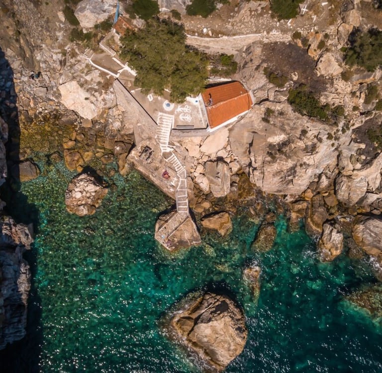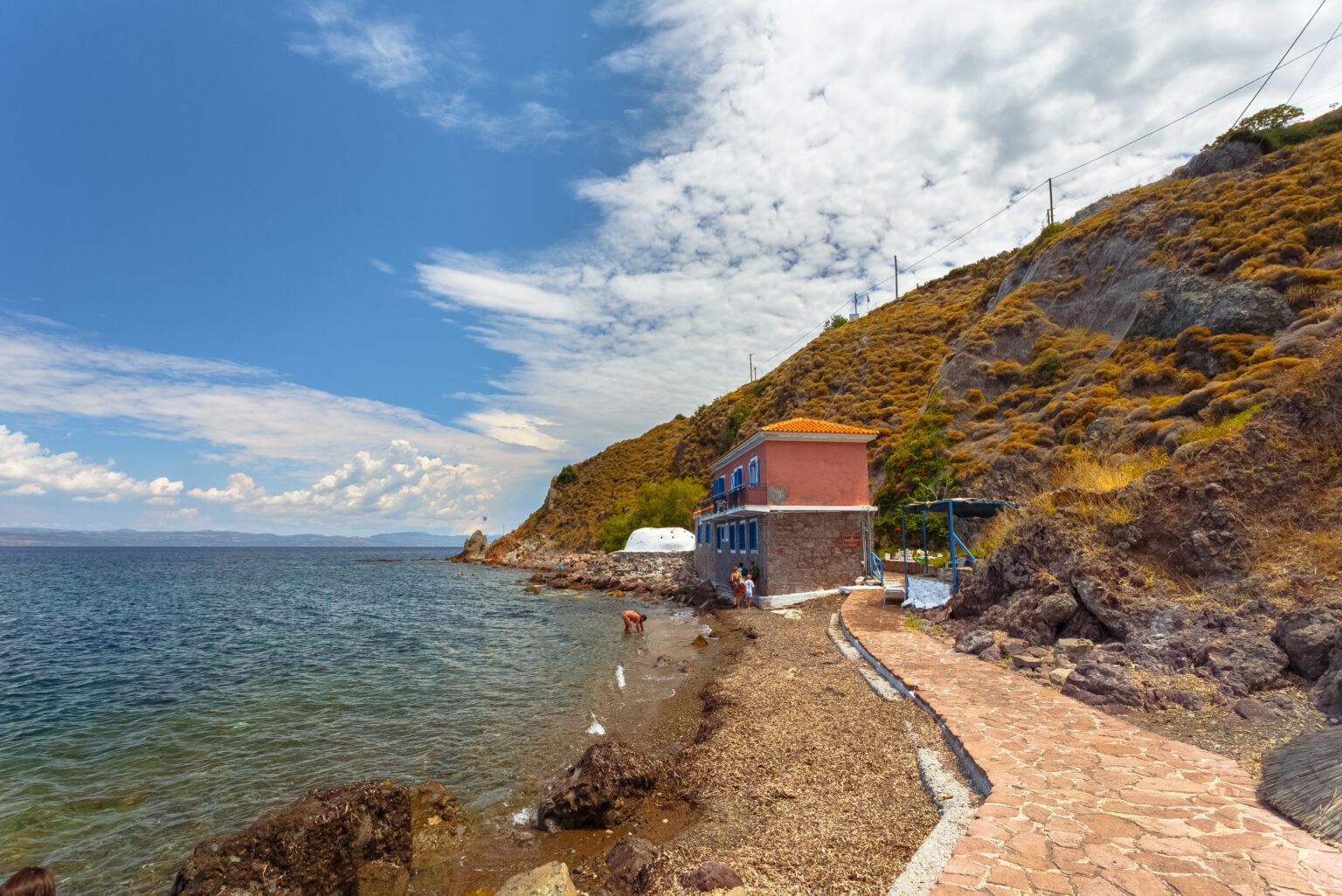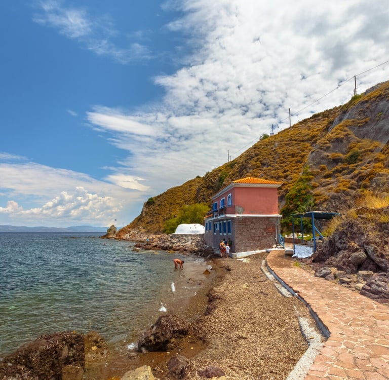 Visitors will come across a stone building containing some rooms inhabited by boats, some others that once functioned as vestries. From these rooms, stairs lead to a coast, where a crack reveals the entrance to a small cave. Inside there a little lake filled with hot water. Many visitors arrive by boat, stopping several meters away and swimming or using a smaller boat to reach the shore. Alternatively, you can access the location by land, with a 57-kilometre journey from Mytilini Town and from Melinda, the nearest settlement.