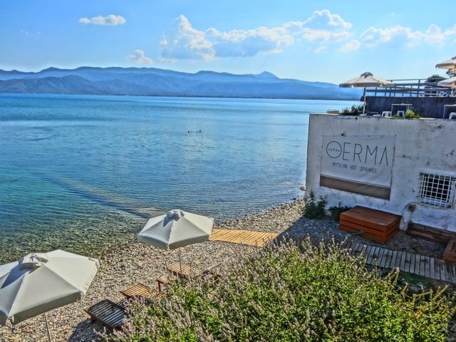 Behind the relatively new bath house with its individual bathtubs, are the ancient baths which is now closed to the public. The beach town of Skala Thermi itself has many large cafes in front of the sea and two excellent fish tavernas.